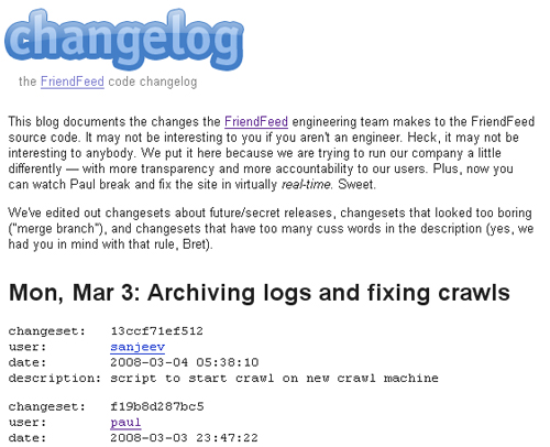 Friendfeed yaratıcısı eski Google'lı Paul Buchheit kendisinden beklenen büyük adımları bir bir herkesin gözünün önünde atacağa benziyor. Son fikri olan Changelog, FriendFeed kaynak kodunda yapılan değişikliklerin tüm dünyadaki yazılım mühendisleri ve kullanıcılarla paylaşıldığı blog. Şirket başlattığı bu uygulama sayesinde ilerleyen dönemlerde tüm şirketlerin kullanıcılarına karşı daha saydam ve sorumlu olduklarını ifade edecek olan changelog fikrinin ateşleyicisi oldu.