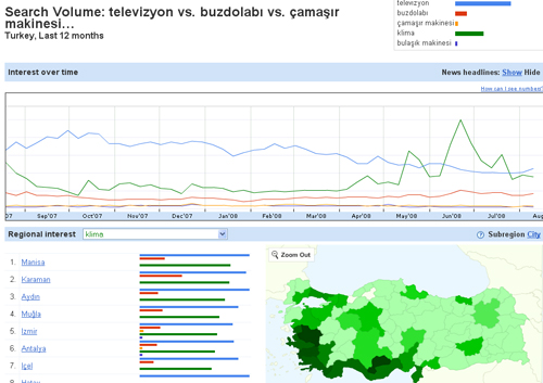 Ekran görüntüsündeki karşılaştırmaya buradan ulaşabilirsiniz. Gördüğünüz gibi son 12 ayda en çok aranılan ürün klima ve ondan sonra televizyon geliyor. Alttaki il bazındaki sonuçlarda ürün olarak klimayı seçtim, bunu seçerken düşündüğüm şey klimaya olan ilginin yoğun olduğu bölgeleri haritadan görebilmekti. Gelir, e-ticaret kullanımı, sıcaklık gibi faktörler sabit olmasa da haritadaki sonuç tam anlamıyla Google Insight'la neler yapılabileceğini özetliyor.