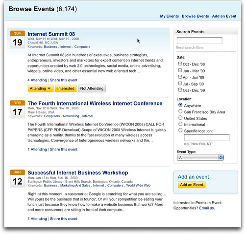 LinkedIn Etkinlik sayfalarında tarih, lokasyon ve toplantı türüne göre detaylı aramalar yapılabilmekte. Bunun dışında etkinlik paylaşmak, önermek, etkinliğe katılacak insanları görmek mümkün. LinkedIn'in etkinlik sayfaları tasarım olarak bir numaralı rakibi Xing'e kıyasla daha sade ve basit.