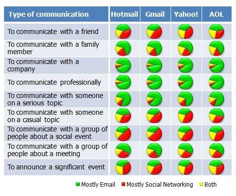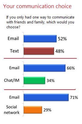 - Kişisel e-posta hesaplarına bağlılık sürüyor. Ankete tabi tutulan kişilere, arkadaşları ve aileleriyle iletişimlerini sürdürmek için sadece bir iletişim yöntemi seçmeleri gerekirse hangisini seçecekleri soruldu. E-posta, SMS, anlık mesajlaşma ve sosyal ağ seçenekleri arasından, çoğu kişi diğer iletişim yöntemlerine kıyasla e-postayı tercih etti.