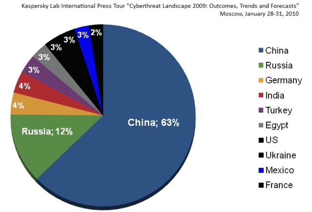 Kaspersky Lab'ın istatistiklerine göre bu tür zararlı içerikleri üreten ülkelerde ilk sırayı Çin alıyor. Google'ı dahi karıştıran Çin'i, Rusya, Almanya, Hindistan ve Türkiye takip ediyor. Güney Amerika kökenli ve Linux tarzı açık kaynak kodlu işletim sistemi taraftarlarının da Windows'u yıpratmak adına saldırılarda bulunduğunu dile getiren Göçe, Türkiye'nin üst sıralarda olmasını yabancı hackerların ülkemizdeki savunmasız bilgisayarları Zombi bilgisayar olarak kullanmasıyla açıklıyor.