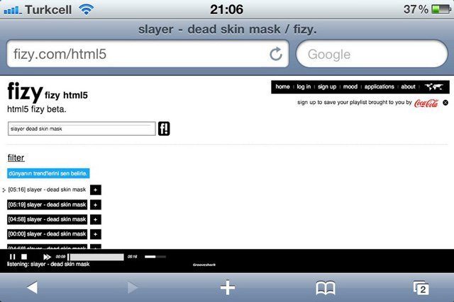 Fizy'nin online müzik dinleyicileri arasında önemli bir yere sahip olduğunu biliyoruz. Webrazzi 2009'da da Yılın En İyi Yeni Web ve En iyi Müzik Girişimi seçilen Fizy'nin bu potansiyelini detaylı olarak Fizy infografikte de görmüştük. Hitap ettiği kitleyi tanıyan Fizy de özellikle Apple ürünlerini hedefleyerek HTML5 sürümünü beta olarak yayına almış(tı).