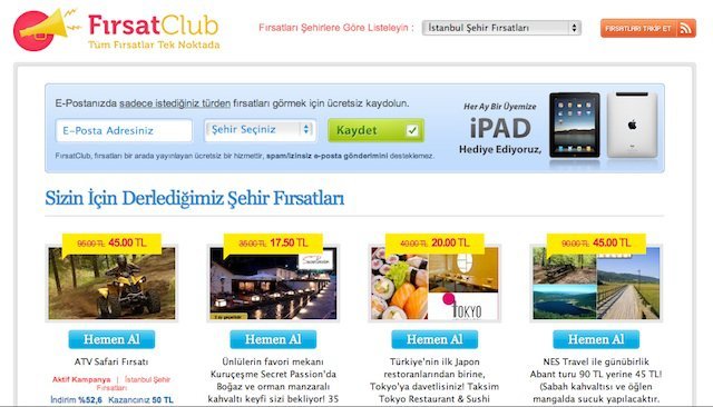 Eğer benim gibi günlük olarak aldığınız fırsat ve kampanya e-posta'larından baygınlık geçirme seviyesine gelenlerdenseniz, daha önce paylaştığımız Firs.at, FirsatBuFirsat.com gibi başarılı arayüzleri ve kullanım rahatlığını beğendiğim FirsatClub.com'u da değerlendirmenizi ve incelemenizi öneririm. Ek olarak belirtmekte fayda var, servis her ay bir üyesine de iPad hediye ediyor. ;)