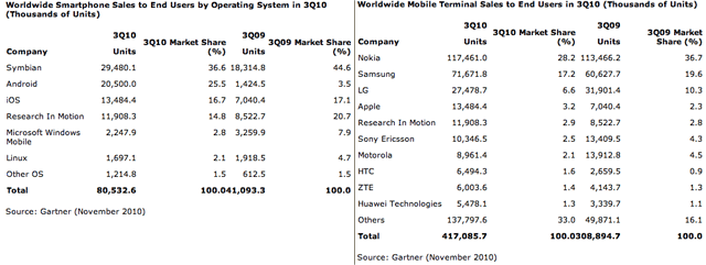 2010 3. çeyrek akıllı telefon işletim sistemleri raporuna göre Symbian'ın pazar payı bir yılda %44,6'dan %36,6'ya düşmüş. iOS %0,4 pazar payı kaybederken Android 2009'da %3,5 olan pazar payını %25,5'e yükseltmiş.