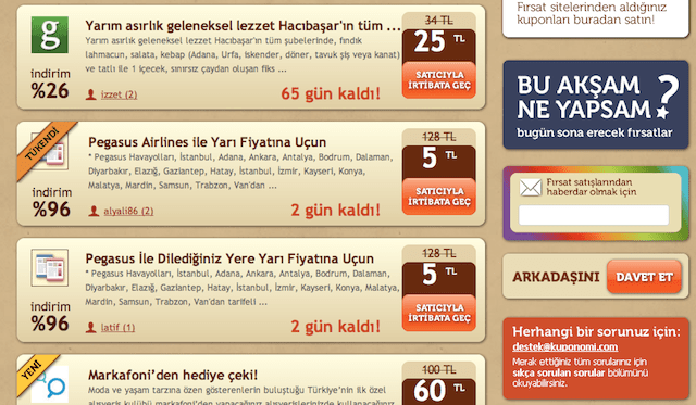 Durum böyle olunca aslında ortada ciddi oranda satın alınmış ama kullanılmamış fırsat kuponu olduğunu biliyoruz. Haliyle birisinin bu tür kullanılmamış kuponları değerlendirmesi ya da değerlendirilebilecek bir platform kurması gerekiyordu. Etohum'un eleme sürecinde 40 girişim arasına giren, ancak ilk 15'e kalamayan Kuponomi işte bu noktada hayatımıza girdi ve kullanılmamış fırsat kuponları için bir pazaryeri oluşturdu. Beta olarak yayına girmiş olan servis, kupon sahiplerinin sahip oldukları fırsatı satışa çıkarması ve ilgilenen kişilerin de onlarla iletişime geçmesi prensibine dayanıyor. Şu an için aslında Sahibinden.com'un kuponlar için olan modeli gibi düşünebileceğiniz servis, önümüzdeki 3 ay içinde biraz daha GittiGidiyor.com'a yaklaşıp ödeme havuzu ve kupon kontrolü gibi modelleri uygulamaya başlayacak. Kupon listelemenin şimdilik ücretsiz olduğu servis sözünü ettiğim çalışmalar gerçekleştirildiğinde gerçekleşen satışlar üzerinden komisyon almaya başlayacak.
