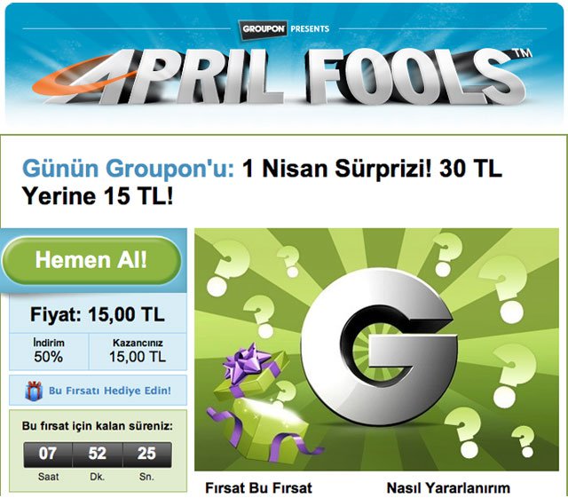 Şehirfırsatı 1 Nisan'a özel kampanyasında neresi olduğu süpriz olan bir mekanda 15 TL'ye kahvaltı veriyor. Global'de ise Groupon 1 Nisan şakalarının fikri haklarını aldığını ve 1 Nisan şakası yapan Youtube, Grooveshark gibi servislere ihtarname çektiğini açıkladı :)