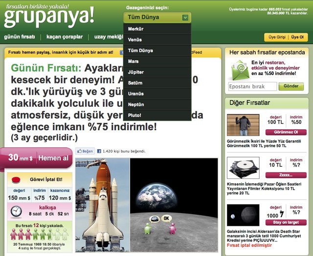 Türkiye'den de örnekleri görmek mümkün. Grupanya 30 milyon dolara Ay yürüyüşü satışa çıkararak en ilginç şakayı yaptı. 30 milyon dolardan satılan Ay yürüyüşlerinden 12 kişi satın almış, Grupanya'nın cirosu bu ay epeyce yüksek olacak anlaşılan. :) Grupanya'nın 1 Nisan'a özel diğer fırsatlarında ise Görünmezlik iksiri, kimsenin seyretmediği öğlen saati filmleri koleksiyonu ve Galaksinin incisi Alderan'da Deathstar manzaralı 3 günlük tatil var :)