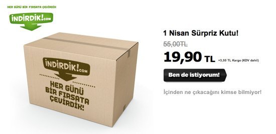 Türkiye'de 1 Nisan'a özel çalışma yapanlardan biri de indirdik.com. İçinde ne olduğunu (gerçekten) bilmediğimiz bir kutu bugüne özel günün fırsatı olmuş. İçinden ne çıkacağını bizler de merak ediyoruz :) Alanlar lütfen bizleri de bilgilendirirse seviniriz.