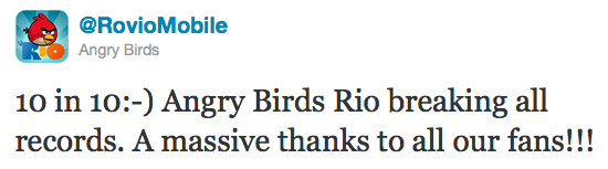 Rovio'nun Twitter hesabından paylaşılan bilgiye göre Angry Birds Rio şimdiden 10 milyon indirilme sayısına ulaşmış. İlk olarak iPhone sürümü çıkan oyunun sadece birkaç gün önce Android versiyonu da Google Android Market'te yerini aldı.