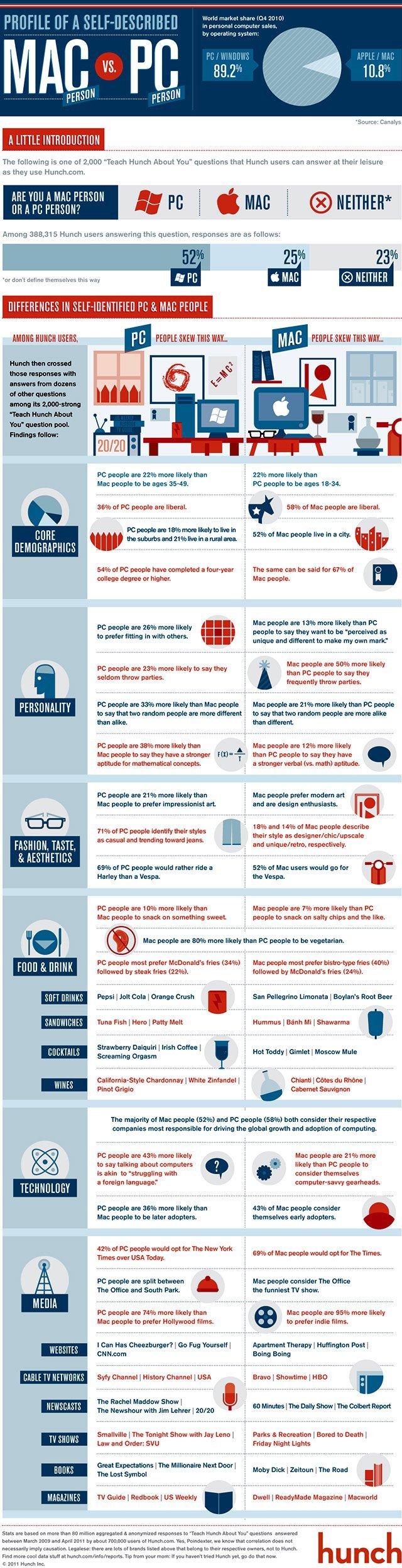 Mac ve PC kullanıcı tiplerinin farklılıklarının analiz edilmeye çalışıldığı infografik, 338.315 Hunch üyesinin verdiği cevaplar sonucunda ortaya çıkartılmış.