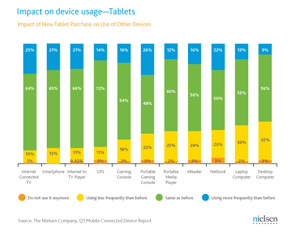 Tablet bilgisayar sahiplerine bilgisayar alışkanlıklarındaki değişim sorulduğunda ise aynı zamanda masaüstü bilgisayara sahip olan kullanıcıların %35'i eskisine göre daha az veya neredeyse hiç bilgisayar kullanmadıklarını paylaşmış. Tablet bilgisayarla birlikte aynı zamanda bir dizüstü bilgisayara sahip olan kullanıcıların ise %32'si ise tablet cihazlarını aldıktan sonra dizüstü bilgisayarlarını daha az kullandıklarını belirtmiş. Daha detaylı bilgi için aşağıdaki grafiği inceleyebilirsiniz.