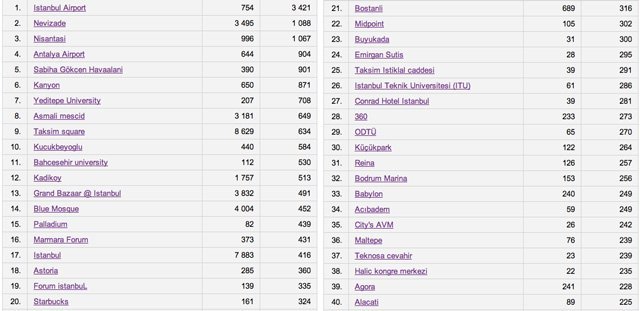 Havaalanlarının listenin üst sıralarında yer alması ülkemize gelen yabancıların yüksek kullanım oranlarına işaret ediyor olabilir. Çünkü listede aşağılara doğru inildikçe check-in sayılarında hızlı bir düşüş görünüyor. Listenin 49. sırasında her maçta 50 bin kişinin bulunduğu Şükrü Saraçoğlu Stadı'nda yapılmış toplam check-in sayısının 178 olması Facebook Places'ın beklenen ilgiyi şimdilik göremediğinin bir göstergesi olarak kabul edilebilir :)