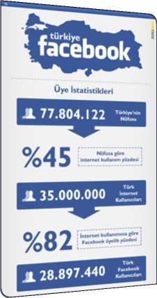 İnfografikteki sayılardan bahsedecek olursak, Türkiye nüfusu internetstats.com'un verisine göre 77.804.122, çeşitli kaynaklardan aldığımız bilgiye göre Türkiye'de ortalama 35 milyon internet kullanıcısı olduğunu söyleyebiliriz. Socialbakers'ın rakamlarına göre ise Türk Facebook kullanıcılarının sayısı 28.897.440, yani Türk internet kullanıcılarının %82'si Facebook üyesi.
