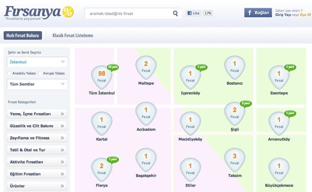 Firsanya.com'u diğer fırsat aggregatorlardan ayıran özelliği ise "Hızlı Fırsat Bulucu" olarak adlandırdıkları ve çok başarılı çalışan filtreleme arayüzleri. Adından da anlaşıldığı gibi fırsatları türüne ve bulundukları ilçeye göre ayırabilen Hızlı Fırsat Bulucu başarılı arayüzüyle, hızlıca aradığınız tipte fırsata ulaşmanızı sağlıyor.