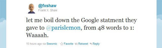 Bu resmi açıklamada yer alan ve "zorbalık" olarak tercüme edilebilecek (extort) olan bölüm gerçekten de Google'ın ne kadar kızgın olduğunu net bir biçimde gösteriyor. Ama bakış açısına göre bu yorumu mızmızlanma olarak da yorumlamak mümkün. Tahmin edebileceğiniz gibi Microsoft'un yaklaşımı bu oldu ve firmanın kurumsal ilişkiler başkan yardımcısı Frank Shaw, Google'ın orijinal metni 48 kelimeden oluşan bu açıklamasını Twitter hesabı üzerinden tek kelime ile şöyle özetledi: "Waaaah". (Firmanın resmi açıklaması ise biraz daha uzun.)