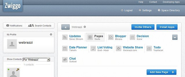 Zwiggo'nun şık arayüzü ile kullanıcıyı kendine çeken bir yapısı var. Basitliğin ön planda tutulduğu siteye üye olduğunuzda oluşturduğunuz grup sayfası yalın bir şekilde geliyor. Siz dilediğiniz uygulamaları grup sayfanıza ekliyor ve kullanıcıları davet ediyorsunuz. Sürükle-bırak tekniği ile kişiler arası iletişimi kolayca sağlıyorsunuz.
