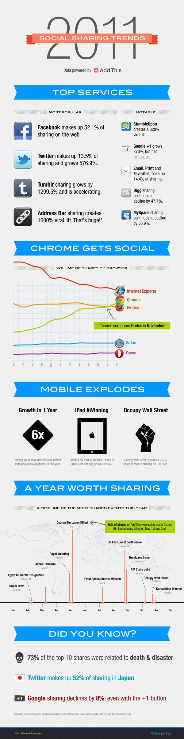 Twitter ve Facebook düğmelerinden önce popüler paylaşım platformlarından biri olan AddThis, 2011 yılına dair bazı paylaşım verilerini açıkladı. Clearspring şirketine ait AddThis, dünya üzerinde toplam 11 milyon web sitesi tarafından kullanılmakta ve AddThis butonları tam 1.2 milyar kullanıcıya ulaşmakta.