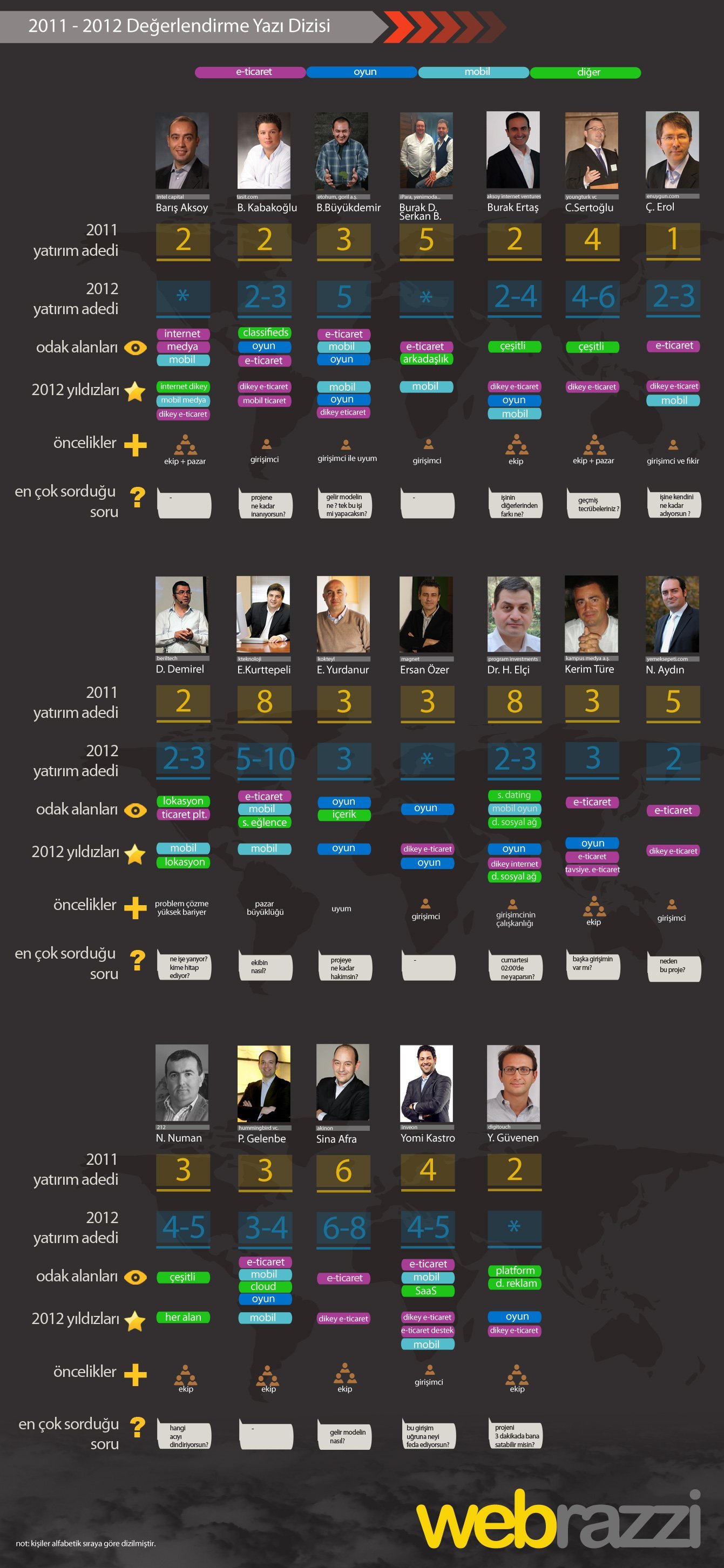 2011 yılını kapatırken bildiğiniz gibi bir yazı dizisi başlatmıştık. Yazı dizisini toparlamak ve girişimcilere 2012 yılı ile ilgili ipuçları vermek amacıyla bir infografik hazırladık. 19 yatırım yapabilecek kişi ile görüştük. Listede görüşmeye fırsat bulamadığımız çok değerli kişiler de oldu fakat yıl sonu olması nedeniyle yoğun tempoda herkesi yetiştiremedik.