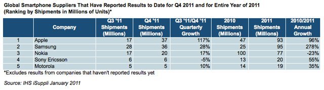 IHS iSupply'ın yayınladığı rakamlara göre dördüncü çeyrekte Apple piyasaya 37 milyon adet akıllı telefon sürerken, Samsung 36 milyonda kaldı. Üçüncü sırada tüm olumsuzluklara rağmen 20 milyon adete ulaşmayı başaran Nokia yer alıyor. Sony Ericsson 6, Motorola ise 5 milyon adet akıllı telefon satmış durumda.