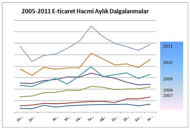 Bu analizlerde de aylık ve dönemsel e-ticaret hacimleriyle ilgili verilerin reel değerleri baz alınmıştır. Aylık dalgalanmaları gösteren yandaki grafikte ise son 7 yılın aylık dalgalanmalarının birbirine oldukça paralel seyrettiği görülüyor. Özellikle son yıllar dikkat çekici bir biçimde benzerlik gösteriyor.