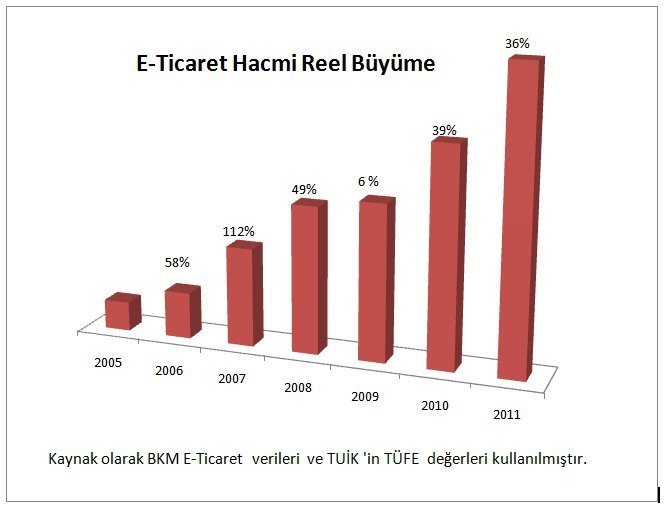 E-ticaret hacmindeki yıllık reel artış sağdaki grafikten de görüleceği gibi 2006 yılından itibaren bir önceki yıla göre yüzde 58 artmış ve artış oranları 2007’de yüzde 112, 2008’de yüzde 49, 2009’da yüzde 6, 2010’da yüzde 39 ve 2011’de yüzde 36 olarak gerçekleşmiştir.