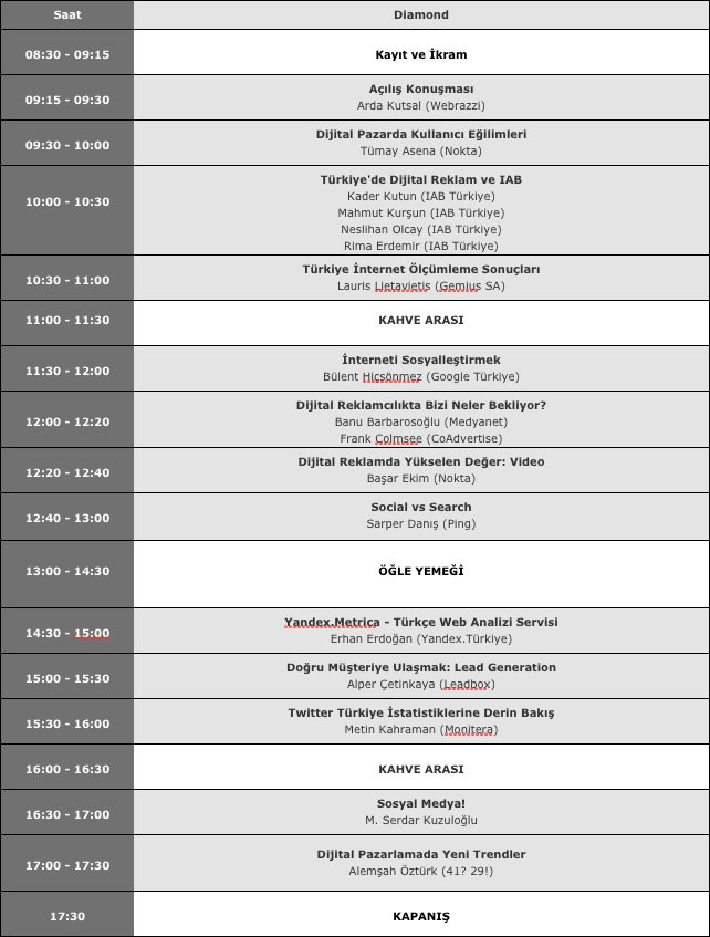 İşte tüm bu konuları, yararlı veri ve analizler eşliğinde 14 Mart Çarşamba günü gerçekleşecek Webrazzi Dijital'12 Konferansı'nda tartışıyor, paylaşıyor olacağız. Sektörle hangi düzeyde olursa olsun bir bağınız veya ilginiz varsa, önde gelen isimlerin sunumlarını mutlaka takip edin deriz.