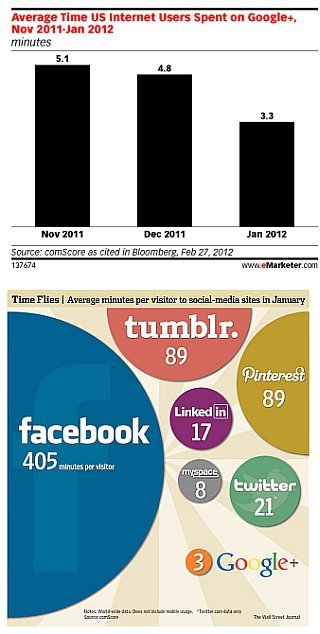 WSJ'nin Comscore kaynaklı verdiği görselde Facebook'ta kullanıcı başına sitede geçirilen ortalama aylık süre 405 dakika, Tumblr ve Pinterest'te 89 dakika, Twitter.com'da 21 dakika, Linkedin'de ise 17 dakika olarak veriliyor. Myspace bile kullanıcıların ayda ortalama 8 dakikasını alırken Google+ 3 dakika ile son sırayı alıyor.