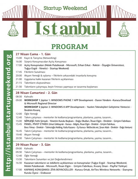 Üçüncü kez İstanbul'da düzenlenen Startup Weekend organizasyonu bugün başlıyor. Pazar gününe kadar devam edecek etkinlikte katılımcılar 2 gün içerisinde fikirlerini hayata geçirmeye çalışacaklar. Webrazzi ekibinin de takip edeceği etkinlik ile ilgili haberleri takip edebilir ve PozitifTV'nin sağladığı canlı yayını bu yazının devamında izleyebilirisniz.