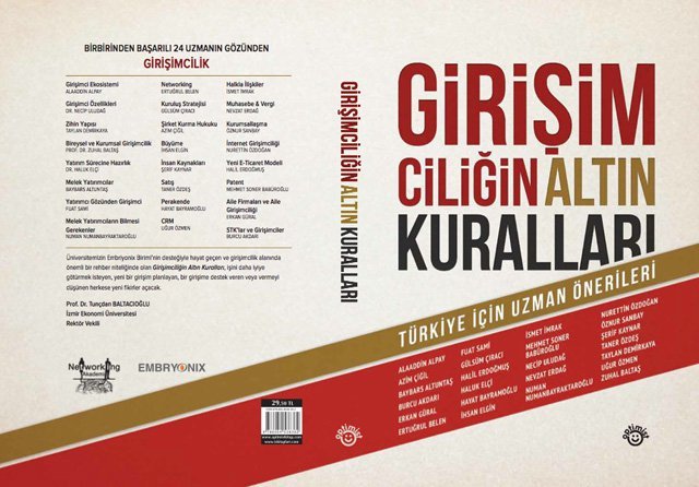 Bu hafta sonu piyasaya çıkacak olan Girişimciliğin Altın Kuralları kitabı da benzer şekilde tüm girişimcilere bu sürecin hemen her aşamasında faydalı olabilecek bir çalışma. Girişimcilik konusunun farklı alanlarında tecrübeli 24 farklı ismin kendi kalemlerinden anlatımlarının yer aldığı kitabı Networking Akademi’den tanıdığımız Ertuğrul Belen ve Embryoniks Kuluçka merkezinden Taylan Demirkaya derlediler.