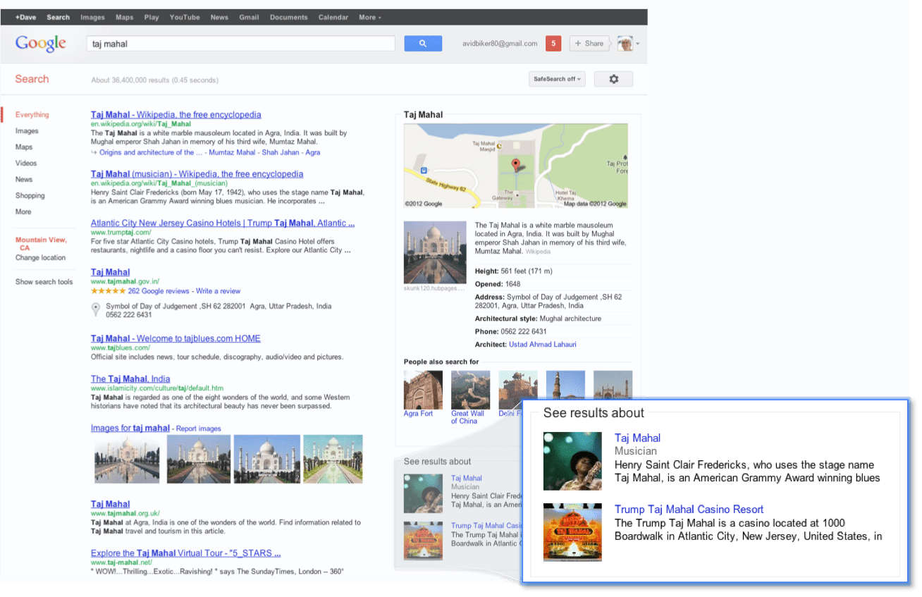Google kendi blogunda Taj Mahal örneğini vermiş. Google artık arama sonuçlarını derlerken sizin bir yapı olan Taj Mahal'i mi, yoksa müzisyen olan Taj Mahal'i mi aradığınızı anlayabilecek.