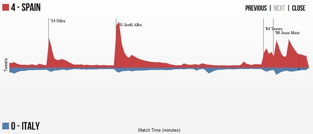 Final maçı süresince toplam 16,5 milyon tweet gönderildi ve İspanya’nın dördüncü golü ile birlikte birlikte gönderilen tweet sayısı saniyede 15.358’e ulaştı. Spor alanında bu rakam bir Twitter rekoru. Twitter da turnuva boyunca gönderilen tweet’leri ayrıca takip ederek etkileşimli bir grafik hazırladı. Bu grafikte hangi gün ve dakikalarda, hangi takımlarla ilgili kaç tweet gönderildiğini görmek mümkün.