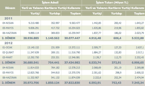 Kıyaslama açısından geçen sene ikinci çeyrekte yayınlanan rakamları da bir hatırlayalım. E-ticaret sektöründe 2011 yılı ikinci çeyrekte 5 milyar 522 milyon TL'lik hacim yaratılmıştı. Söz konusu dönemdeki işlem adedininse yaklaşık 30 milyon olduğunu hatırlatmak istiyoruz.
