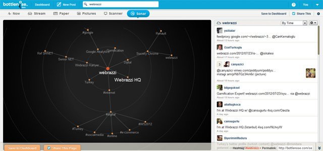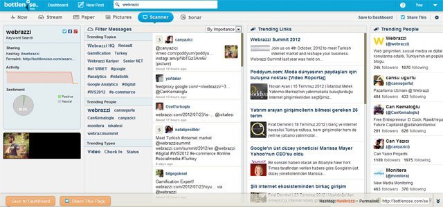 Facebook, Twitter, LinkedIn, Google+ gibi sosyal ağların yanı sıra Instagram ve benzeri fotoğraf paylaşım ağlarını da tarayan Bottlenose’un “Scanner” bölümü arama kelimesi ile aktiviteleri yakından tarayarak “Now”dakine benzer ama daha detaylı şekilde sunuyor.