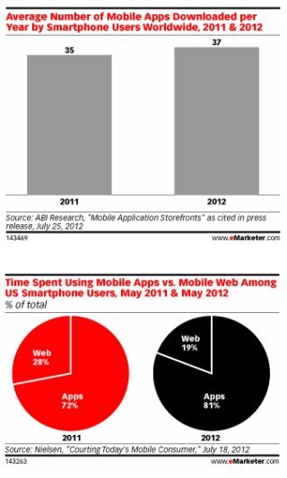 Diğer yandan Nielsen'in bir araştırması ABD'de 2011-2012 kıyaslamasında mobil uygulamalara ayrılan kullanım oranının yüzde 72'den yüzde 81'e çıkacağını gösteriyor. eMarketer de 2016 itibariyle ABD'deki cep telefonu kullanıcılarının yüzde 74'ünün akıllı telefon sahibi olacağını paylaşıyor.
