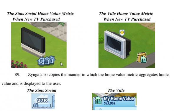 Business Insider'da yer alan iddialara göre Zynga, Electronic Arts oyunu olan The Sims Social'ın tasarımından mekanizmasına kadar birçok öğeyi kopyalamış durumda. Patent davası kapsamında değerlendirilecek suçlamada Electronic Arts'ın elinde birçok delil niteliğinde bulgu bulunuyor. Özellikle oyun karakterlerinin davranışları her iki oyunda da hemen hemen aynı diyebileceğimiz nitelikte.