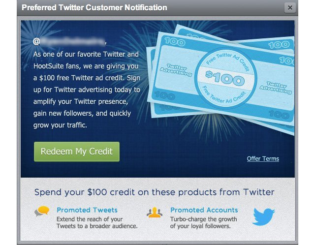 Twitter da Hootsuite iş birliği sayesinde bu firmaları birer reklam verene dönüştürmek adına 100 dolarlık Twitter reklam kuponu hediye etmeye başlıyor.