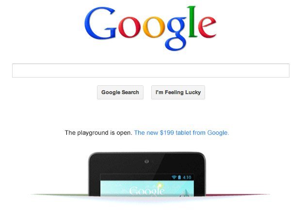 Google'ın geçtiğimiz aylarda I/O etkinliğinde duyurduğu Nexus 7 tablet için bu yasak delindi. Çünkü şu anda Nexus 7'nin satışa çıktığı ülkelerden Google'a girenler anasayfada hareketli bir Nexus 7 bannerıyla karşılaşıyor.