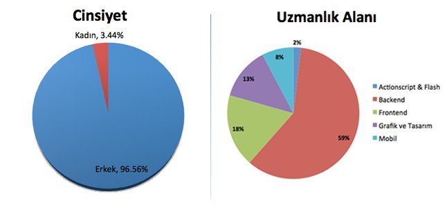 Gelelim IT sektöründeki çalışanların uzmanlık alanlarına. Tahmin edildiği gibi ağırlık backend yazılımcılarda. Backend yazılımcılar sektördeki istihdamdan yüzde 59.6 pay alırken, ikinci sırada bulunan frontend yazılımcıların oranı yüzde 17.8. Üçüncü sırada yüzde 12.9 ile grafik ve tasarımcılar yer alıyor. Uzmanlık alanı mobil olanların oranı yüzde 7.7'de kalmış durumda. Son sıradaysa yüzde 1.9 ile Actionscript & Flash alanında uzman olanlar var.