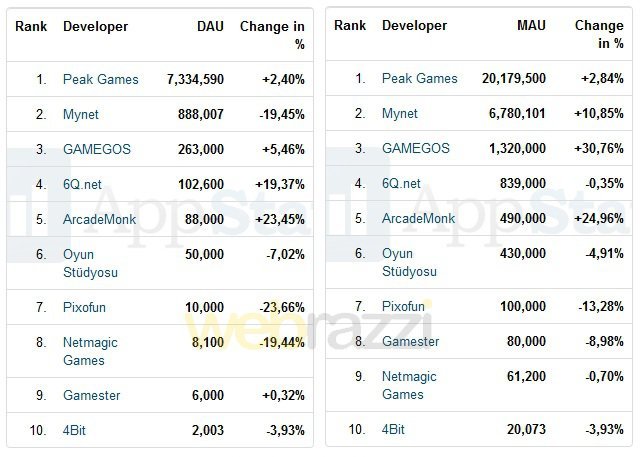 Bu bilgileri göz önünde bulundurarak baktığımızda Peak Games günlük aktif kullanıcı (GAK - DAU) bakımından 7.33 milyon oyuncu ile aylık aktif kullanıcı (AAK - MAU) bakımından da 20.17 milyon oyuncu ile ilk sırada geliyor. Bu iki paraleldeki aylık değişimler birbirine yakın görünüyor, sırasıyla 2.4 ve 2.84.