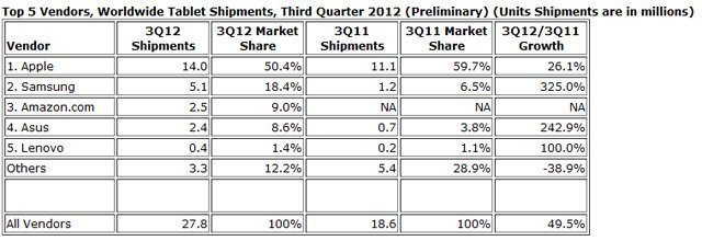 Amazon, 2,5 milyon tablet ile yüzde 9, Asus 2,4 milyon adet ile yüzde 8,6 ve Lenovo 400 bin adet ile yüzde 1,4 paya sahip. Bu büyük firmaların dışında kalanlar tarafından piyasaya sürülen 3,3 milyon adet tabletin payı ise yüzde 12,2.