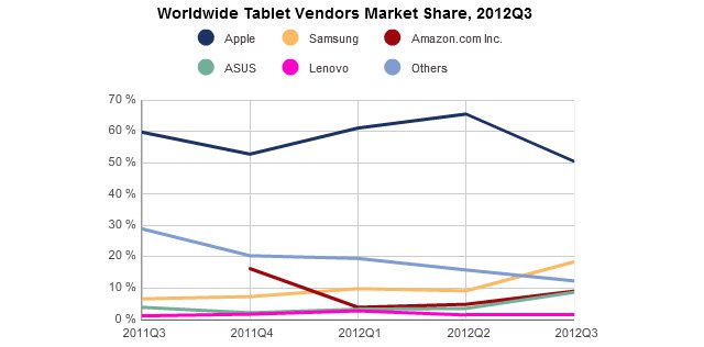 Yüzde 50,4 pazar payına sahip olan Apple, 2012’nin üçüncü çeyreğinde piyasaya 14 milyon adet tablet yani iPad sürmüş durumda. İkinci sırada olsa da rakibinin epeyce gerisinde kalmış olan Samsung’un pazar payı ise yüzde 18,4. Son çeyrekte piyasaya sürülmüş Samsung tabletlerinin sayısı ise 5,1 milyon adet.