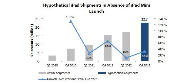 Daha önceki verilere bakıldığında iPad satışlarının 2010’un dördüncü çeyreğinde yüzde 133, 2011’in aynı döneminde ise yüzde 66 arttığı gözleniyor. Bu verilere göre Singh, eğer iPad Mini hiç piyasaya çıkmasaydı dördüncü çeyrekte yüzde 33’lük bir artış ile toplam 22,7 milyon adet iPad satılacağını tahmin ediyor.