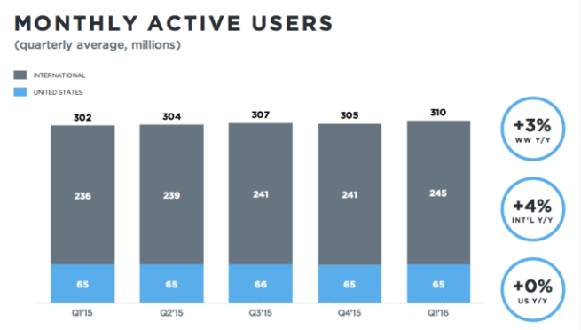 Aktif kullanıcı sayısında da Twitter için işlerin iyi gittiğini söylemek zor. Aylık 310 milyon aktif kullanıcıya sahip olduğunu açıklayan Twitter'ın ABD'deki aktif kullanıcı sayısı 65 milyona takılı kalmış gibi görünüyor. Twitter, ABD'de son 5 çeyreğin sadece birinde 66 milyonu kullanıcıyı yakalamış ve bir sonraki çeyrekte yine 65 milyona gerilemişti.