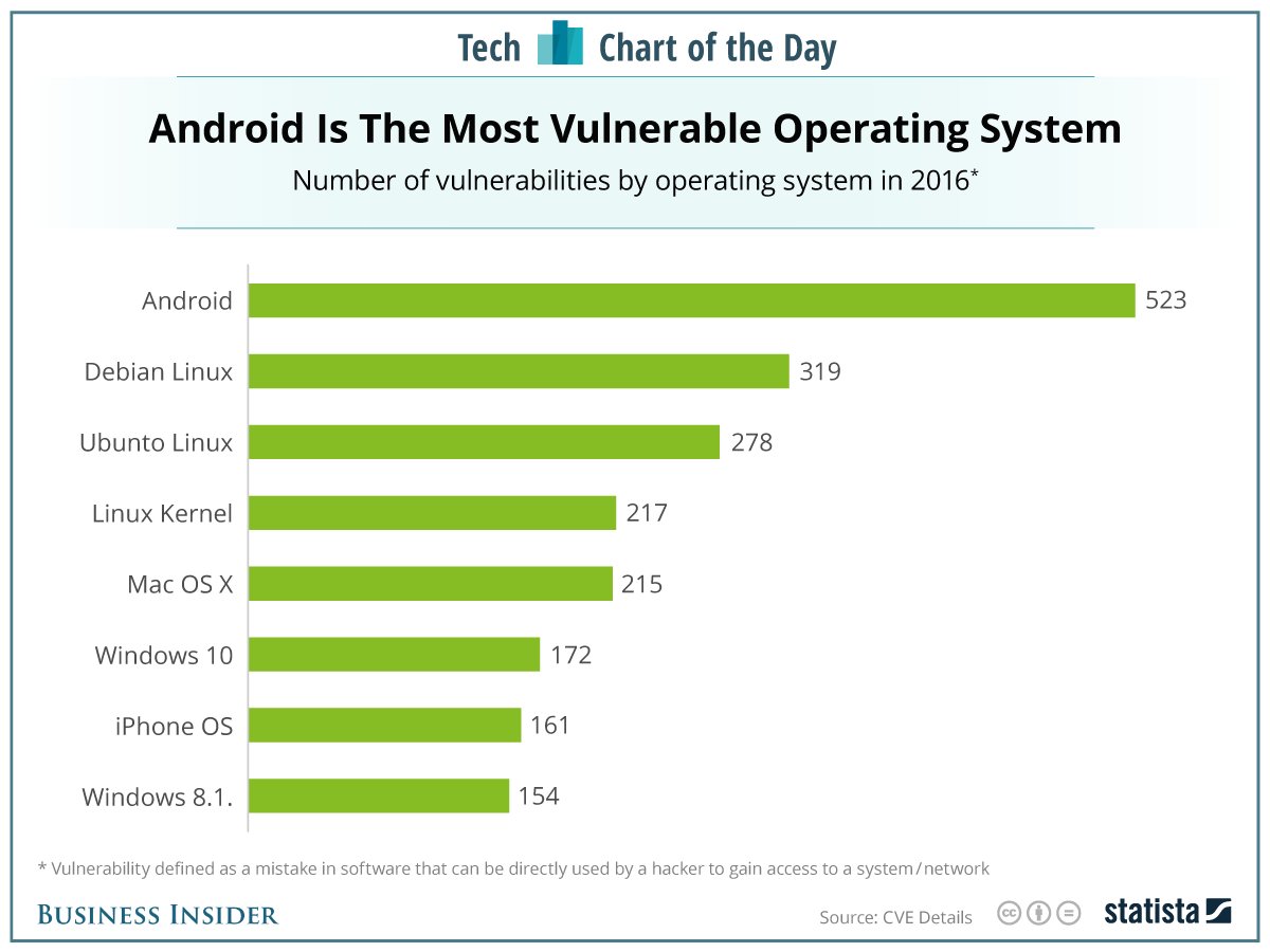 2016 verilerine göre Android'de 523 zayıf nokta bulunurken, ikinci sıradaki Linux türevlerinden Debian'ın 319, Ubuntu'nun 278 zayıf noktası var. Linux Kernel yani Linux çekirdeği de bizzat 217 noktadan tehdite açık. Listede Mac OS X 215, Windows 10 172, iPhone OS yani iOS ise 161 zayıf nokta ile yer alıyor. Windows 8.1 ise 154 açık nokta ile buradaki listenin son sırasında.