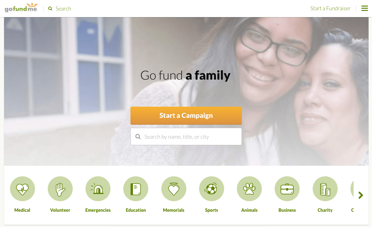2008 yılında kurulan GoFundMe ise 2010'dan bu yana 25 milyondan fazla bağışçıdan 3 milyar dolar toplamış bir platform. Şimdiye dek 2 milyon kampanyaya ev sahipliği yapmış ve geçen yıla göre yüzde 300 büyümüş. GoFundMe'nin kampanyalardan aldığı komisyon payı yüzde 5. Aldığı yatırım tutarı bilinmiyor ama Accel Partners ve Greylock Partners GoFundMe'nin yatırımcıları arasında.