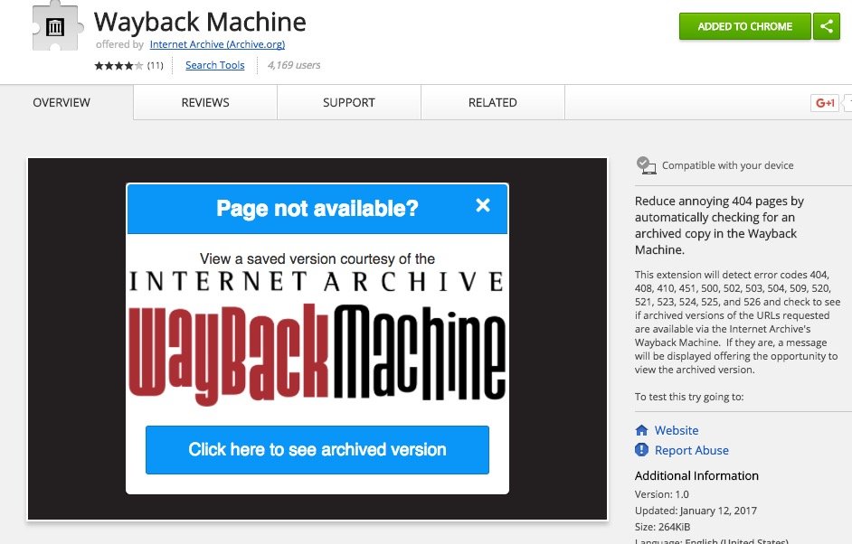 1996'dan bu yana interneti arşivleyen The Internet Archive milyarlarca websitesine ait yaklaşık 280 milyar sayfayı Wayback Machine aracılığıyla kullanıcıların erişimine sunuyor. Arşiv, özellikle yayını durdurulan ya da ortadan kaldırılan sayfaları bulmak için en işlevsel adreslerden biri. Chrome eklentisi, bu sayfalara gitmeniz ve bunları bulamamanız durumunda (404 ya da "sayfa bulunamadı" mesajı gördüğünüzde -link rot) doğrudan arşive giderek bu sayfalara ait ekranların olup olmadığını sorguluyor. Varsa, sayfanın son kaydedilen halinin erişilebilir olduğu, Chrome eklentisi üzerinden bir bildirimle kullanıcıya sunuluyor.