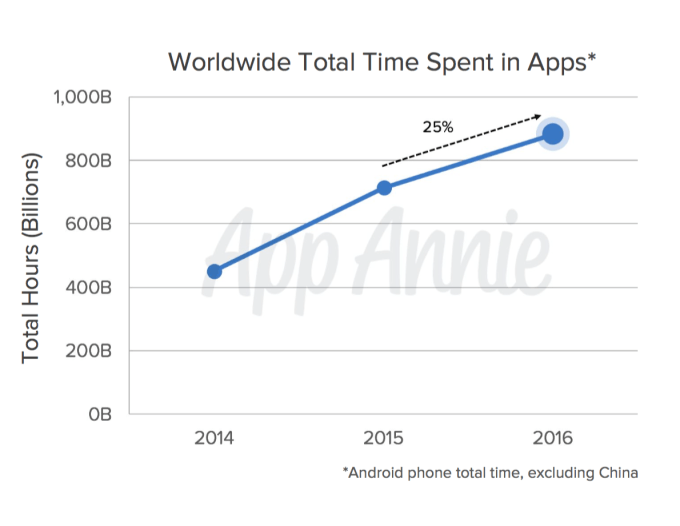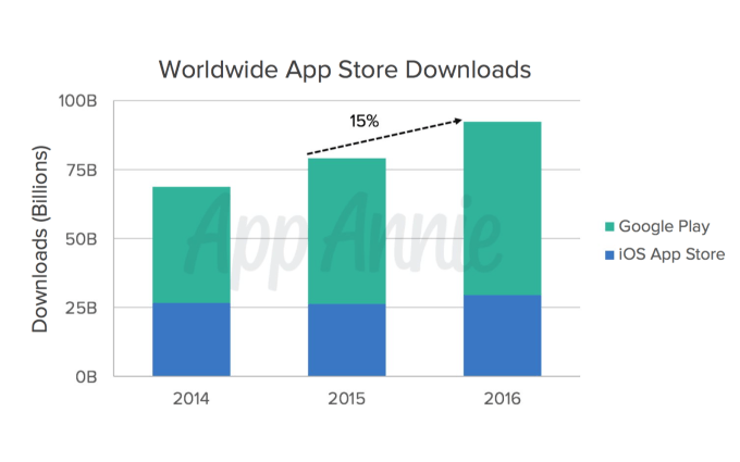 App Annie'nin yayınladığı yıllık rapora göre 2016'da hem uygulama indirme sayısı, hem uygulama içinde geçirilen süre, hem de uygulamalardan elde edilen gelirler artış gösterdi. Dünya çapında mobil uygulamaların indirilme oranları yüzde 15, uygulama içerisinde geçirilen süre yüzde 25, mobil uygulamalardan elde edilen gelirlerse yüzde 40 arttı. 2015 yılının büyüme oranlarıyla aşağı yukarı aynı seviyelerde olan indirilme sayıları, iOS için 13 milyar, Android için ise 90 milyar seviyelerini aştı. Çin pazarı sayesinde iOS platformunun indirilme rakamlarının 2015'e oranla daha fazla artış gösterdiğini de ekleyelim.