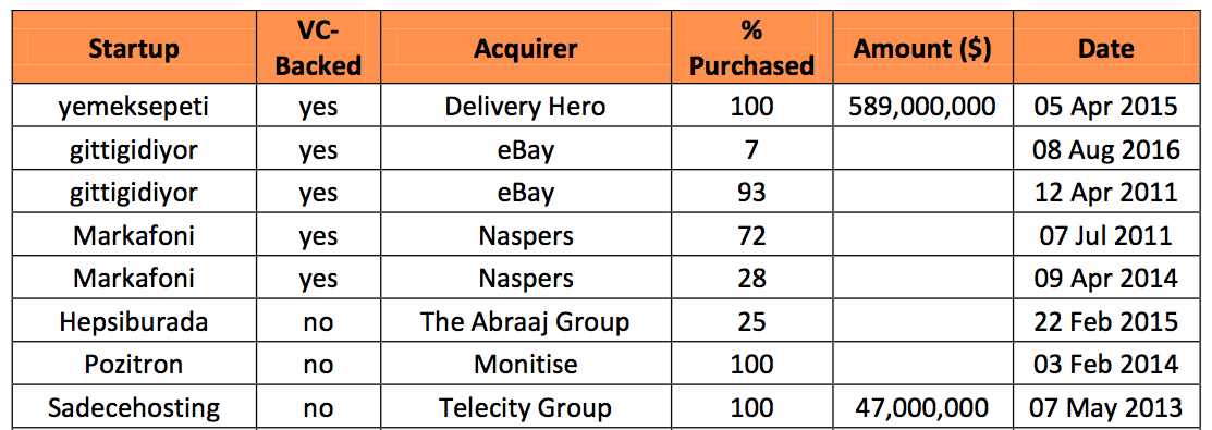 Diğer yandan 2016 Girişimcilik ve Teknoloji Ticarileştirme Raporu'na göre bugüne kadar Türkiye'de gerçekleşen en büyük satın alma-yatırım Yemeksepeti. Yemeksepeti'ni sırasıyla GittiGidiyor, Markafoni, Hepsiburada, Pozitron ve SadeceHosting izliyor.