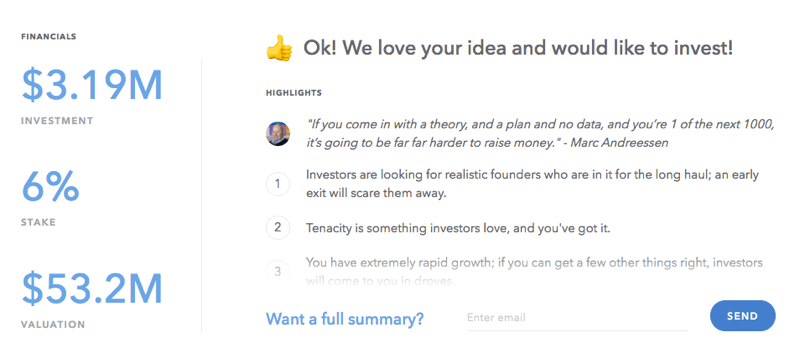 Platform sunumun başarılı şekilde sonuçlanması durumunda yatırımcıların ne kadarlık bir değerleme üzerinden ne kadar miktarda yatırım yapabileceklerini görebiliyorsunuz. Başarısız olması durumundaysa hangi kısımlarda girişimin eksikliklikleri olduğunu ve nasıl geliştirilebileceğine dair geri dönüşlerle sonlandırıyor. Bununla birlikte, her iki senaryoda da yatırımcıların detaylı geri dönüşlerini de dilerseniz mail olarak sizlere iletebiliyor.