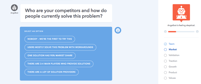 Pitchbot platformunda sunum yapabileceğiniz melek yatırımcı, girişim hızlandırıcı, VC firması ve tohum yatırımcılardan oluşan 4 farklı yatırımcı grubu bulunuyor. Bu gruplardan hangisine karşı sunum yapılacağı seçildikten sonra platform, sizlerden girişiminiz ile ilgili bilgileri çoktan seçmeli sorularla edinmeye başlıyor. Ürün, takım, büyüme oranı, market verileri ve girişiminizin anlık gelir miktarı gibi konularda hazırlanan çoktan seçmeli sorulara verilen yanıtlara göre yatırımcıların görüşleri şekillenmeye başlıyor.